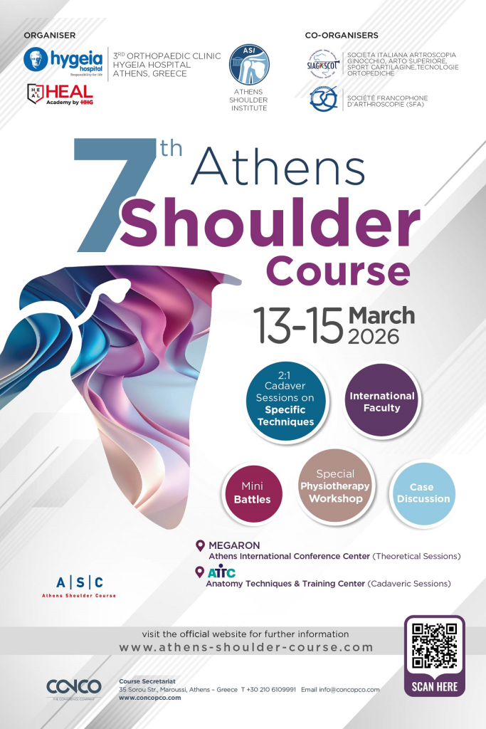 Με ιδιαίτερα μεγάλη συμμετοχή και διεθνή απήχηση ολοκληρώθηκε το 7ο Διεθνές Σεμινάριο  Ώμου “Athens Shoulder Course 2026”, ένα από τα σημαντικότερα επιστημονικά γεγονότα στον τομέα της χειρουργικής του ώμου στην Ευρώπη. Στο σεμινάριο συμμετείχαν πάνω από 350 επαγγελματίες υγείας, ενώ το πρόγραμμα πλαισιώθηκε από περισσότερους από 100 Έλληνες και διεθνώς καταξιωμένους ομιλητές και εκπαιδευτές, μεταξύ των οποίων συγκαταλέγονται κορυφαίοι ορθοπαιδικοί χειρουργοί με εξειδίκευση στον ώμο.