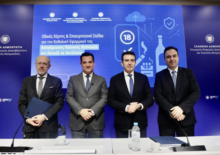 Οι Υπουργοί Υγείας Άδωνις Γεωργιάδης, Ψηφιακής Διακυβέρνησης & Τεχνητής Νοημοσύνης Δημήτρης Παπαστεργίου, Προστασίας του Πολίτη Μιχάλης Χρυσοχοΐδης και ο Υφυπουργός Υγείας Δημήτρης Βαρτζόπουλος παραχώρησαν σήμερα, Τετάρτη 18 Μαρτίου 2026, Συνέντευξη Τύπου στο Υπουργείο Ψηφιακής Διακυβέρνησης, παρουσιάζοντας τον «Οδικό Χάρτη και το Επιχειρησιακό Σχέδιο για την Καθολική Εφαρμογή της Απαγόρευσης Πώλησης Καπνικών Προϊόντων και Αλκοόλ σε Ανηλίκους».